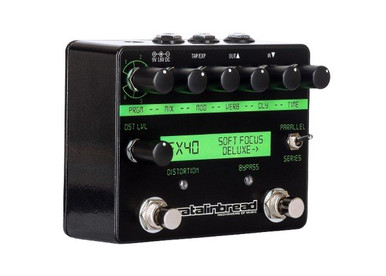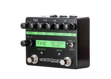 In addition, the Catalinbread Soft Focus Deluxe also features a foot-switchable high-gain op-amp distortion with fixed gain and level that can be blended in via the distortion level control. Further tone shaping can be achieved with the series/parallel switch. In series, the distortion happens before the Soft Focus effect, similar to how a traditional pedal chain would be laid out and in parallel, the distortion circuit replaces the dry signal path within the Soft Focus and the mix control now blends between the distortion sound and the Soft Focus sound.