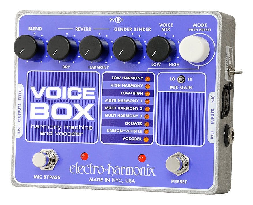The Electro Harmonix Voice Box Harmony & Vocoder Pedal is back in stock. Arriving with you in New condition and made by Electro Harmonix, so no worries about warranties and all that. This is just a great pedal Pedal Vocoder & Harmony Box Voice Harmonix Electro Guitar Effect Pedal- Electro Harmonix Voice Box Harmony and Vocoder PedalThe Electro Harmonix Voice Box is a moving harmony machine and vocoder all in one amazing pedal! The harmonies featured in the Voice Box move in a smooth human-like transition rather than in steps Many unique features such as a whistle, a gender bender option (male to female voice and vice-versa), independent reverbs on dry and harmonies, built-in vocoder and much much more! Don’t just take our word for it though – hear what the Voice Box can do for yourself with these videos from Electro Harmonix!Electro Harmonix Voice Box Harmony Vocoder Effect, including Power Supply (96DC-200)FeaturesIntelligent vocal harmonies: follows the chords you play on