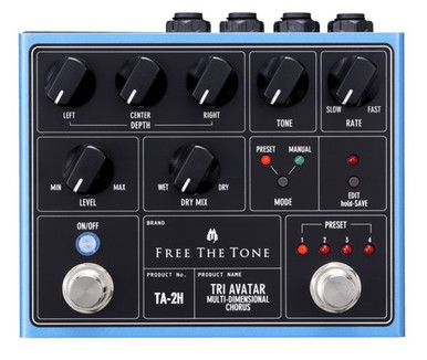 The Free The Tone "TRI AVATAR" is a next generation chorus pedal with four signal paths for three chorus sounds (three phases) and one dry signal. In stereo operation the first phase of chorus sound is assigned to the L side, the second phase to the L+R sides, and the third phase to the R side. In monaural operation all of the three phases are mixed together. By mixing three independent chorus sounds the TRI AVATAR adds more width and depth to its output and the result exceeds that which can be achieved by conventional stereo chorus pedals. Problems with usual chorus units such as unintentional pitch changes, sound images with blurred lower end, and noises relating to sweep timing have been solved by combining Free The Tone's analog and digital technologies and with its unique know-how. The result is our completely new chorus pedal that will amaze its users with the various incredible sounds that can be created by a single chorus pedal.