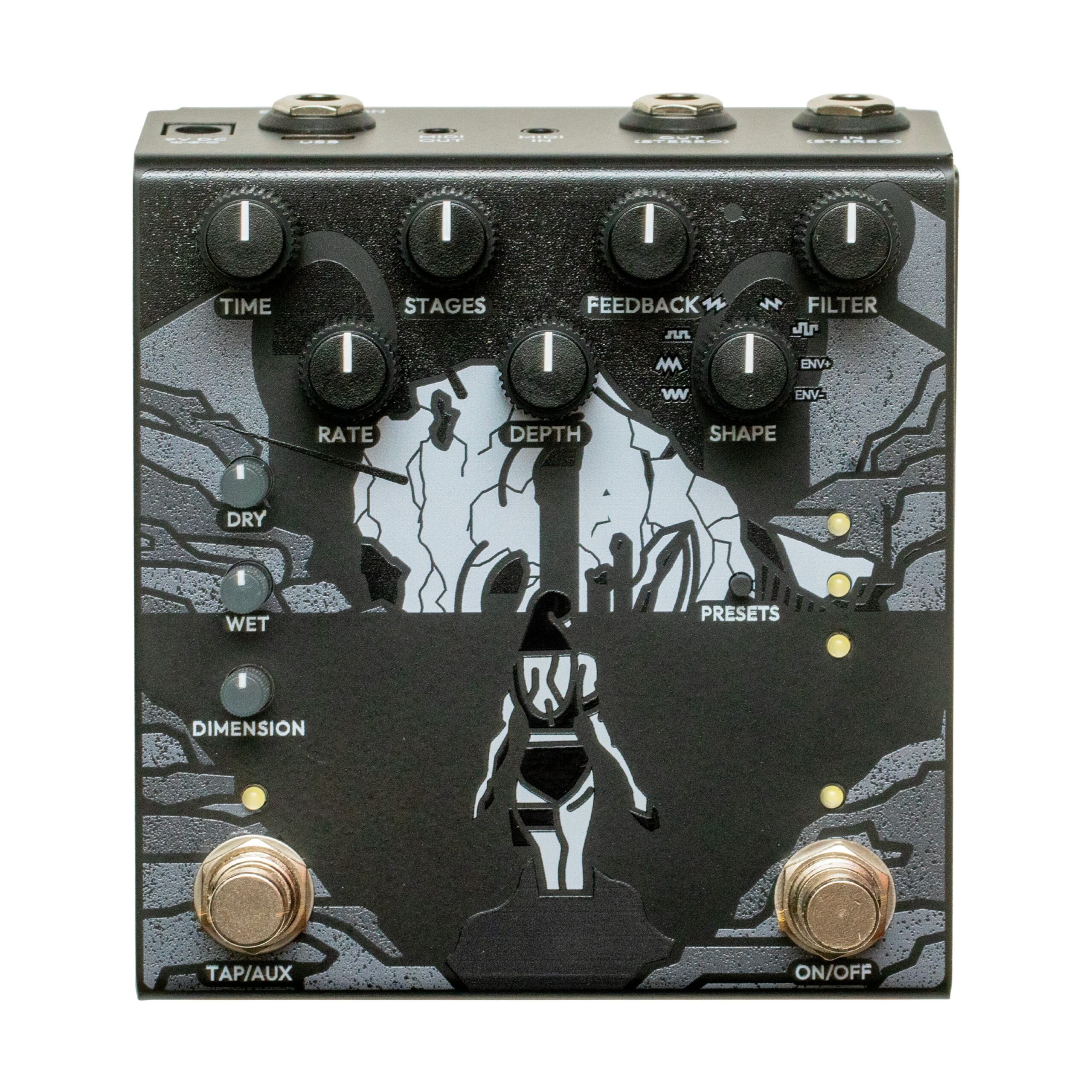 4. **Stereo Phaser**: Stereo phaser pedals modulate the phase of the guitar signal in stereo, producing sweeping, swirling effects. Stereo phaser pedals can create dynamic stereo modulation effects that move back and forth between the left and right channels, enhancing the stereo image and spatial dimension.