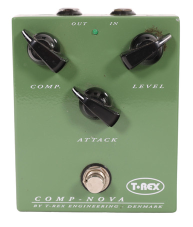 Comp. Compressor — A compressor pedal evens out your playing by reducing the volume of loud notes and boosting quieter ones, creating a more balanced and consistent sound. It helps smooth dynamics, add sustain, and bring out detail in your tone — especially useful for clean guitar parts, funk rhythms, and country-style picking. By controlling attack and release settings, you can tailor how quickly the compression reacts, from subtle smoothing to tight, punchy control.